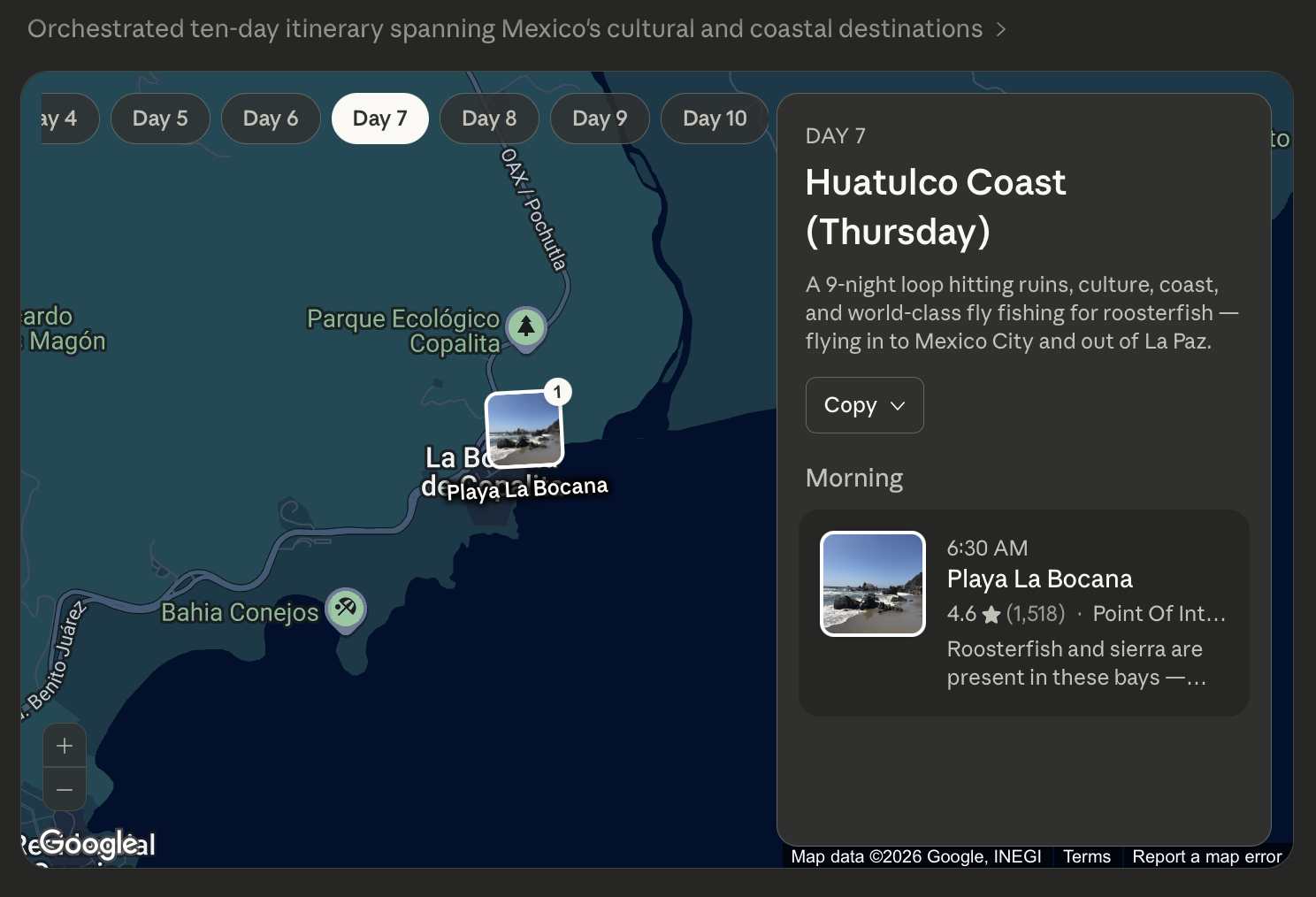 Sunday afternoon I sat down to plan a fishing trip to Baja California. I opened Claude, described what I was looking for — roosterfish on the fly, maybe a few days in Mexico City on the way down — and asked for some help thinking through the itinerary.